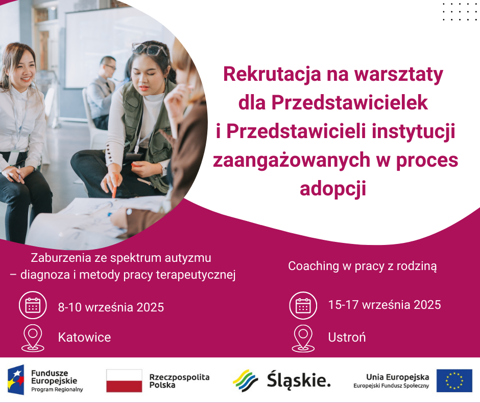 Zapraszamy do uczestnictwa w warsztatach pt. „Zaburzenia ze spektrum autyzmu – diagnoza i metody pracy terapeutycznej” oraz „Coaching w pracy z rodziną” organizowanych przez Śląski Ośrodek Adopcyjny w Katowicach w ramach projektu pn. „Skoordynowane wsparcie pre i post adopcyjne”. Projekt dofinansowany jest przez Unię Europejską w ramach Europejskiego Funduszu Społecznego Plus. Zgłoszenia przyjmowane są do 28 sierpnia 2025 roku. Poniżej znajdują się szczegółowe informacje nt. warsztatów.