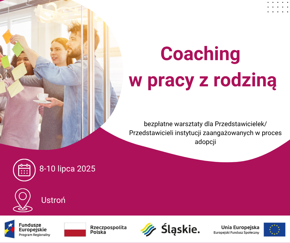 Zapraszamy do uczestnictwa w warsztatach pt. „Coaching w pracy z rodziną” organizowanych przez Śląski Ośrodek Adopcyjny w Katowicach w ramach projektu pn. „Skoordynowane wsparcie pre i post adopcyjne”. Projekt dofinansowany jest przez Unię Europejską w ramach Europejskiego Funduszu Społecznego Plus. Zgłoszenia przyjmowane są do 17 czerwca 2025 roku. Poniżej znajdują się szczegółowe informacje nt. warsztatu.